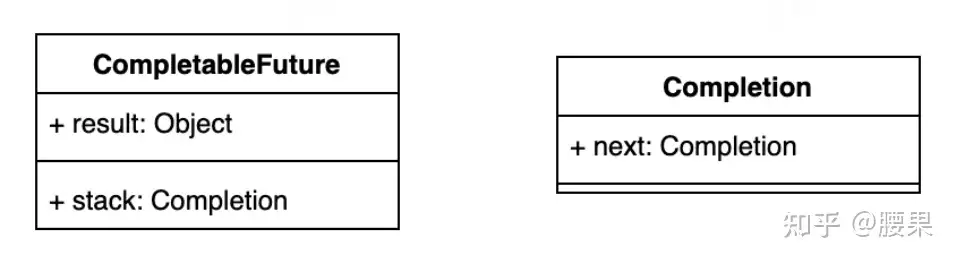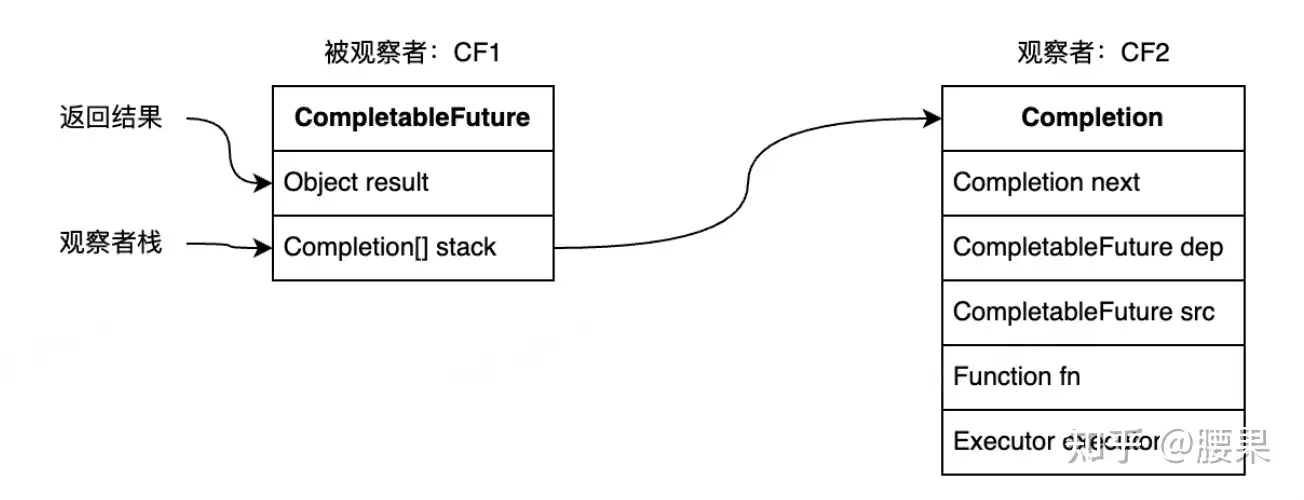 CompletableFuture中包含两个字段:result和stack。result用于存储当前CF的结果,stack(Completion)表示当前CF完成后需要触发的依赖动作(Dependency Actions),去触发依赖它的CF的计算,依赖动作可以有多个(表示有多个依赖它的CF),以栈的形式存储,stack表示栈顶元素。这种方式类似“观察者模式”,依赖动作(Dependency Action)都封装在一个单独Completion子类中。
